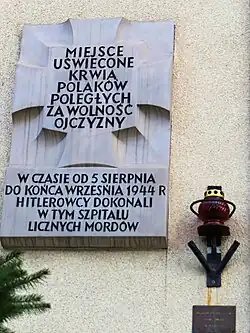 - 37 Wolska Street – a plaque designed by Karol Tchorek, embedded in the front wall of the building, commemorates the victims of murders committed by the Germans on the grounds of the St. Stanislaus Infectious Disease Hospital. In the hospital courtyard, there is another commemorative plaque dedicated to two young insurgents hanged by the Germans shortly after the hospital's capture (the plaque gives the incorrect date of September 9);[250][251]