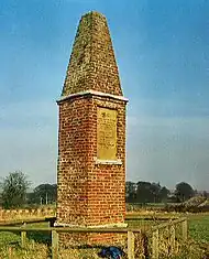 On 13 December 1795 a meteorite crashed on the outskirts of the village, landing within metres of ploughman John Shipley.[12] As a monument to this event, there is a brick column bearing the inscription below.[13] The meteorite is now housed in the Natural History Museum in London. The event inspired the development of the body of science fiction literature known as the Wold Newton family by American author Philip José Farmer.[14]
