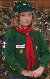 The Wolf Cub uniform is a green jumper and group scarf (neckerchief), a cap, or beret for girls, with grey short trousers.