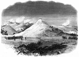 On January 7, 1877, soldiers established an encampment to the west of the river on the eastern half of the battlefield. The encampment was backed by tall bluffs. The Battle of Wolf Mountains took place on January 8, 1877. On January 9, a rifle pit was constructed by F Company, Twenty-second infantry at a lookout site atop a rock wall. The rifle pit can still be seen, and is the only contributing structure on the site.[4]