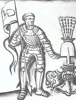 Wolfgang was a descendant of the Herren von Graben family, who descend from the Meinhardiner dynasty.[1] He belonged to the Styrian line on Kornberg, which had descended from the Konradin line am Graben around and at Graz at 1314. This line owned the larger lordships of Kornberg and Marburg, Obermarburg (Maribor) among a lot of smaller fiefs in the Duchy of Styria. His parents were Ulrich III von Graben and Agnes Närringer.[2] Ulrich III Was imperial Governor of Styria, burgrave of Graz and Marburg, senior official and councilor of the Holy Roman Emperor Friedrich III of Austria. He had two older brothers in Andree and Wilhelm, both his successor as Lords of Kornberg and Marburg and a cousin in Virgil von Graben, high official, governator of the County of Gorizia, as well as imperial governor and advisor of the Holy Roman Emperors Frederik III and Maximilian I. Wolfgang von Graben was first named in 1470 as heritage Jörg II Steinwalds of some manors of 30 styrian Stubenberg fiefs.[3]