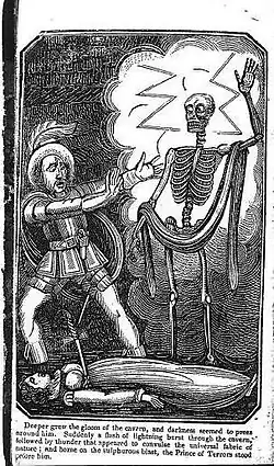 The frontispiece consisted of a drawing of Wolfstein confronted by a skeleton struck by lightning. He stands over the corpse of Serena. The drawing is a more condensed version of the 1822 frontispiece. The caption reads: "Deeper grew the gloom of the cavern, and darkness seemed to press around him. Suddenly a flash of lightning burst through the cavern, followed by thunder that appeared to convulse the universal fabric of nature; and borne on the sulphurous blast, the Prince of Terrors stood before him."