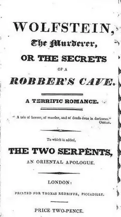 - ^ Wolfstein, the Murderer; Or, The Secrets of a Robber's Cave: A Terrific Romance. To which is Added, The Two Serpents, an Oriental Apologue.