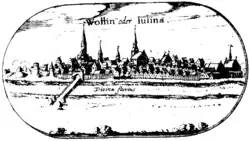 ![]() Wolin Castle at the right edge of a vista on the Map of Lubinus | |
