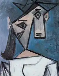 The painting is a cubist abstract depiction of the bust of a woman and was completed in 1939.[1][2][3] The subject is the French photographer Dora Maar, a companion of Picasso between 1936 and 1943. Maar was also depicted by Picasso in The Weeping Woman and Portrait of Dora Maar. Woman's Head appears in a 1940 photograph taken by Maar at Picasso's studio in Rouen, Picasso having moved from his Paris studio during the German occupation.[4]