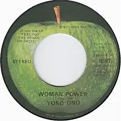 "Woman Power" is a single released by Yoko Ono. It was originally released on 24 September 1973 through Apple. John Lennon played guitar on the track in a performance that Ken Bielen and Ben Urish described as, "especially gritty".[1] Bielen and Urish described Lennon's rhythm guitar solo as prefiguring his guitar playing on his last creative work, Ono's "Walking on Thin Ice".[1] Lennon uses the alias "John O'Cean" for the song, possibly in reference to Ono's name translating as "Ocean Child" in Japanese.[2] A remix version was released on 26 August 2014 through Mind Train / Twisted. It reached number six on Billboard's Hot Dance Club Play chart.
