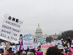In the early 1900s, topics concerning women's reproductive rights were taboo.[13] By the 1960s, this fight for reproductive rights was known throughout the United States.[3] The reproductive rights issue included the freedom to use birth contraceptives, the freedom and access to legal abortions, and the right to birth their children in environments, and with the method, that they found suitable. One specific example of a method not popular in public opinion in the late 1900s, but had been common in the early 1900s was natural childbirth.[8] Women activists who fought for these reproductive rights were key in the passing of decision by the Supreme Court to legalize abortion in 1973 in the case Roe vs Wade.[3] That court decision was overturned in 2022 in Dobbs v. Jackson Women’s Health Organization.[14]