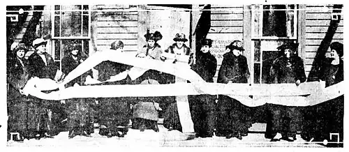 In May 1918, a petition drive was kicked off in Wilmington by women who attended a "subscription luncheon" at Hotel DuPont.[16] Carrie Chapman Catt, Maud Wood Park, and Narcissa Cox Vanderlip were featured speakers.[16] The petitions to the United States Congress to support a federal suffrage amendment had 11,118 names that were secured by 175 volunteers in the state.[31]