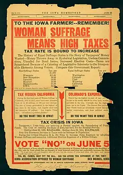 During the campaign, anti-suffragists in the state promoted the idea that women's suffrage would lead to higher taxes.[61] Groups called Farmer's Tax-Payers' Leagues started to appear in every county.[61] A controversy over spending tax money on hard roads in the state led to a rumor that women wanted these roads "estimated to cost millions of dollars, in order that they might ride into the country comfortably in their automobiles!"[62] With women seeming to be the push behind a large tax project, many voters did not want them to become enfranchised.[63] Ads that promoted the idea that women's suffrage would lead to higher taxes began to appear in newspapers.[63] These ads were paid for by a lawyer, Henry Thuenen, who represented Iowa brewers, who were mostly against women's suffrage.[63] The state Republican party had also decided a few weeks before the election to "kill the suffrage amendment quietly."[64] The amendment failed on June 5 statewide by 10,341 votes.[65]
