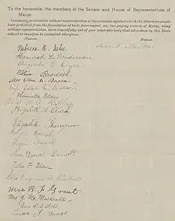 Anti-suffragists in Maine corresponded with the Massachusetts Association Opposed to the Further Extension of Suffrage to Women (MAOFESW).[89] Many upper-class women from the Portland area were interested in opposing women's suffrage.[90] Maine anti-suffragists first sent petitions or "remonstrances" against women's suffrage to the Maine Legislature in 1887.[91] The next round of petitions in 1889 had even more signatures.[91]