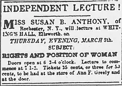 The first public advocacy of women's suffrage in Maine is an 1832 Independence Day speech by John Neal in Portland,[1] in which Neal described the denial of suffrage to women as equivalent to taxation without representation.[2] By the 1850s, Maine was in a state of transition.[3] The abolition movement was important and the temperance movement started to draw more women in Maine.[4] The country's first alcohol prohibition law passed in Maine in 1851.[4] Women's rights also grew in support during the 1850s.[4] Susan B. Anthony came to Maine and gave a lecture in Bangor in 1854.[5] Suffragist Lucy Stone spoke on women's suffrage in Augusta and Cornish in 1855.[6] In Ellsworth, Maine, several women's rights advocates began to work towards women's rights and women's suffrage.[4] Ann F. Jarvis Greely, who had attended the Seneca Falls Convention in 1848, wanted to take action on promoting rights for women.[7] Greely, her sister Sarah Jarvis, and Charlotte Hill worked together to create a committee to bring women's rights lecturers to Ellsworth.[8] The lectures started in 1857.[8] In March of that year, Anthony spoke to a "packed hall" in Ellsworth.[8] There were some threats against the controversial nature of the lecture series, however, overall, the series was "widely attended."[9] In addition to the lectures, the three women hosted a "woman's rights" ball on the evenings of July 3 and 4, 1857 in Ellsworth.[10] Both Greely and Hill also wrote to newspapers under pseudonyms advocating and arguing for improving women's access to equal right.[8] Hill also brought women's rights materials for women to share and distribute.[11] The first women's suffrage petition in Maine, known as a "memorial" was sent to the Maine Legislature in 1857.[12] A second memorial, signed prominently by Greely and Hill, was presented to the legislature in 1858.[11] Maine was one of the first states in the country to petition its legislature on women's suffrage.[12]