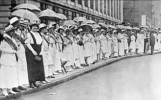 During the 1916 Democratic National Convention, suffragists staged a demonstration.[46] The idea for the silent protest came from Emily Newell Blair in February earlier that year.[47] More than 3,000 women lined twelve blocks along Locust Street, wearing white dresses, "votes for women" sashes and holding yellow umbrellas.[46][48][47] They did not move or talk and the event, which was organized by Edna Gellhorn, was called a "walkless, talkless parade," or the "Golden Lane".[46][49] The demonstration was meant to show how women had been silenced by not being allowed to vote.[49] The event gained national attention in the media.[50] The Democratic delegates voted to support women's suffrage on a state by state basis.[51] Also in June, during the 1916 Republican National Convention, women sent telegrams to the Missouri electors to convince them to support women's suffrage in the Republican platform.[52] The Republican convention declined to support a federal suffrage amendment, but instead supported suffrage by state.[52]