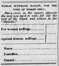 Hilyer's bill was considered for the second time in early 1871.[10] Gordon was given the Assembly Chamber in the Nevada Capitol to speak for women's suffrage and she had "her audience spellbound."[10] Unfortunately, the bill lost by a narrow margin in the Assembly in February "after a bitter struggle."[3] Assemblyman Oscar Grey put forward an unsuccessful women's suffrage resolution in January 1873.[11] In 1881, a Nevada Legislature joint legislative committee recommended amending the state constitution in favor of women's suffrage, but it doesn't gain full support.[11]