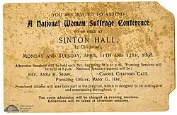 Women gained the right to vote in school board elections in 1894 but the right did not extend to allowing women to vote on bonds involving school infrastructure.[29][30] The National Woman Suffrage Conference was held in Cincinnati in April 1898.[31]