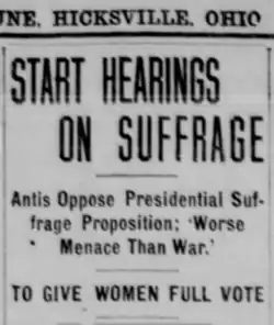 - ^ "Woman Suffrage Advocates Speak for Pending Bill". The Sandusky Star-Journal. 1917-01-25. p. 1. Retrieved 2020-09-13 – via Newspapers.com.