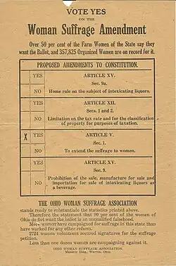 The new Ohio constitution now allowed voter referendums to be placed on the ballot for constitutional amendments.[48] The suffragists in Ohio decided to take advantage of this, putting a woman's suffrage issue before Ohio voters.[48] Between March and July 1914, activists were able to gather more than 130,000 signatures for a women's suffrage referendum.[48]
