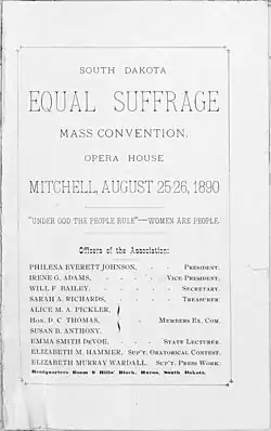 When South Dakota was admitted as a state on November 2, 1889, the new constitution required that a women's suffrage referendum be submitted to the voters by the first legislature, leading to a Fall 1890 constitutional amendment proposal.[8] Plans to organize and campaign started to emerge. [9] Emma Smith DeVoe and her husband, John, founded the South Dakota Equal Suffrage Association (SDESA) on October 21, 1889.[4][10] Emma DeVoe helped create chapters around the state before she and her husband moved.[4] The motto of the organization was based on the state motto: "Under God the People Rule; Women are People."[9] The group did not have a large amount of funding and set about to securing sources of funding.[11] Susan B. Anthony came to South Dakota to do a lecture tour, starting on November 11, 1889.