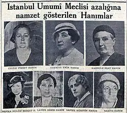 Women used their political rights for the first time in Municipal elections in 1930. The elections lasted from the beginning of September until the 20th of October. Among the women who can enter the city councils are Hasane Nalan and Benal Nevzat Hanım, the two female candidates of the Republican People's Party (CHF) in the Izmir elections and Rana Sani Yaver (Eminönü), Seniye İsmail Hanım (Beykoz), Ayşe Remzi Hanım (Beyoğlu), Nakiye Hanım (Beyoğlu), Latife Bekir Hanım(Beyoğlu) who were CHF candidates in the Istanbul elections are among the women who entered the city councils.[1]