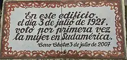 At the municipal level, women were allowed to vote in Uruguay in July 1927 within the plebiscite zone of Cerro Chato.[8] This has been commemorated as the first time that women cast votes in Uruguay.[9][10][11]