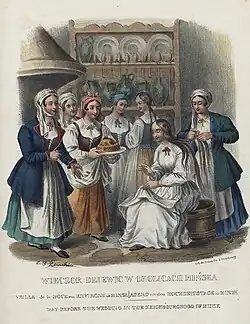 ![]() A group of Belarusian women, wearing their national costumes, while getting the bride (seated) ready for her wedding day, dated before 1841. | |