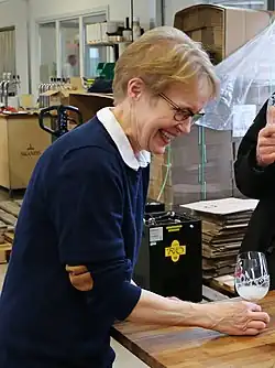 American women such as Jill Vaughn and Rebecca Bennett have been successful at becoming top brewmasters at Anheuser-Busch, where they developed brands such as Bud Light Platinum, Shock Top and the Straw-Ber-Rita.[60] I. Patricia Henry is the first African American woman to manage a major American brewery Miller Brewing Company, now MillerCoors, in Eden, NC. Suzanne Stern Denison and Jane Zimmerman worked at and invested in Sonoma, California's long-shuttered New Albion Brewing, established in 1976 and the first new brewery in America since Prohibition; Jack McAuliffe is most often the only person mentioned as founder.[61] Hart Brewing was co-founded by Beth Hartwell and Tom Baune in 1984 in Kalama, Washington; they were early pioneers of craft brewing in the Pacific Northwest and Hart was the first known woman to co-own a brewery in the post-Prohibition era.[62][63][64][65] Mari Kemper and husband Will opened Thomas Kemper Brewing on Bainbridge Island (near Seattle) in 1985 and now co-own Chuckanut Brewery & Kitchen in Bellingham.[61][66][67] Mellie Pullman is a professor at Portland State University; where she became the first known female brewmaster in the United States when she took a job at Schirf Brewing in Park City, Utah in 1986.[68] Carol Stoudt founded Stoudts Brewing Company in Adamstown, Pennsylvania in 1987; she was one of the first female brewmasters since Prohibition in the country and the nation's first known female sole proprietor. Teri Fahrendorf was the third female craft brewmaster in the country; she worked as a brewer at Golden Gate Brewery and Triple Rock Brewery in Berkeley, California, Steelhead Brewery in Eugene, Oregon.[69][70][71][72] Fahrendorf later founded the Pink Boots Society. Kim Jordan co-founded New Belgium Brewing Company with husband Jeff Lebesch in 1991 in Fort Collins, Colorado.[73] Leah Wong Ashburn took over for father Oscar Wong, who opened Highland Brewing Co. in 1994; it is one of North Carolina's oldest breweries.[74] Mariah and Sam Calagione co-founded Dogfish Head Craft Brewery in 1995.[75][76][77] Natalie and Vinnie Cilurzo, Russian River Brewing's original brewer, acquired the rights to the brand and opened a brewpub in Santa Rosa, California in 2004.[78][61][79] Other women opened early craft breweries in America and have served in numerous capacities other than as the brewer. These include Marcy Larson, who co-founded the Alaskan Brewing Company with husband Geoff in 1986 in Juneau, Alaska; Irene Firmat, who founded Full Sail Brewing Company in 1987 in Hood River, Oregon; Rose Ann Finkel co-founded Pike Brewing Company with husband Charles Finkel in Seattle, Washington in 1989 (and Merchant du Vin in 1978); and Deborah Carey, who founded New Glarus Brewing Company with husband Daniel in 1993 in New Glarus, Wisconsin.[80][81]