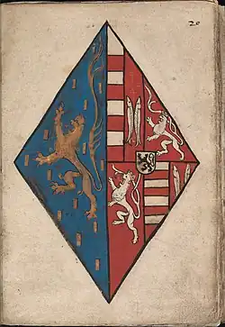 Archduke Charles (later Holy Roman Emperor Charles V), aged 2, with his sisters Eleonore and Isabella. Charles's arms are depicted on a shield with a label indicating that he is his father's heir while those of his sisters are on lozenges with half left blank, to be filed with those of their future husbands. -