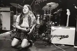 In the 1990s, bands such as Hole, Babes in Toyland, Super Heroines, The Lovedolls and L7 became popular, while demonstrating on stage, and in interviews, a self-confident and "bad" attitude at times, always willing to challenge assumptions about how an all-female band should behave. Courtney Love described the other women in Hole as using a more "lunar viewpoint" in their roles as musicians.[36] In the 1990s, the punk, female-led riot grrrl genre was associated with bands such as Bratmobile and Bikini Kill. Riot grrrl defines the underground, punk feminist movement that stood for uplifting female voices.[37]
