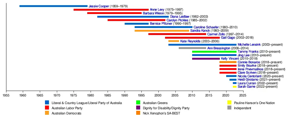 | 8 | Sandra Kanck | Democrats | 11 December 1993 – 30 January 2009 (resigned) |