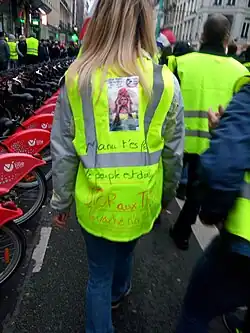 There were around 100 women at the march in Metz, 200 in Douai, and around 300 in Saint-Brieuc. Another 20 women accompanied by around a dozen men marched in Le Mans.[54] In Paris, where several hundred women participated, marchers met on the steps of Opera Bastille, before marching to Place de la République.[43][44][56] One participant in Paris was 40-year-old Sophie Tissier.[53][45][55] Around 300 women marched in Toulouse, their march starting at Place Arnaud-Bernard with a heavy police escort.[43][53] They marched behind a banner that read, "Subverted, discriminated against, rebellious, Women on the front line". (French: "Précarisées, discriminées, révoltées, Femmes en première ligne.")[44][53] Around one hundred women participated at the Caen march. Women brought their children with them, despite heavy violence in the yellow vest march the day before.[43] 28-year-old riding instructor Chloé Tessier said at the Caen march, "The government wants to make us look like thugs, but today we are mothers, grandmothers, we are the daughters, the sisters of all citizens, and we want to say that (...) our anger is legitimate. It is during social crises that women's rights are most at risk."[43][45] Another roughly one hundred women participated in a march in Saône-et-Loire.[43][44]