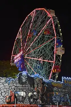 The Wonder Wheel is a 150-foot-tall (46 m) eccentric Ferris wheel at Deno's Wonder Wheel Amusement Park at Coney Island in the New York City borough of Brooklyn.[3] The wheel is located on a plot bounded by West 12th Street to the west, Bowery Street to the north, Luna Park to the east, and the Riegelmann Boardwalk to the south. As with other eccentric Ferris wheels, some of the Wonder Wheel's passenger cabins are not fixed directly to the rim of the wheel, but instead slide along winding sets of rails between the hub and the rim.