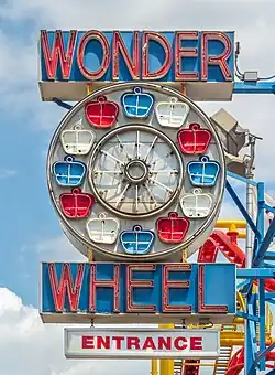 The Wonder Wheel is located at 3059 West 12th Street, just north of the Riegelmann Boardwalk.[2] Its entrance plaza is composed of a steel structure with plywood-and-corrugated metal. The hub of the wheel, supported by two blue-painted legs shaped like the letter "A", contains an illuminated sign with orange letters spelling "wonder wheel" in all capital letters. There are sixteen spokes extending from the hub, each connected at their outer ends by a hexadecagonal frame and braced by green beams, each connected through rivets and gusset plates. The eight stationary cars on the hexadecagonal frame are painted white while the sixteen motion-capable cars are painted red-and-yellow or blue-and-yellow. At West 12th Street is a neon sign weighing 700 pounds (320 kg), overhangs the sidewalk by 7.5 feet (2.3 m), and is raised 10 feet (3.0 m) above the sidewalk; the sign contains letters spelling "wonder wheel" and arrows pointing to the actual wheel. Yet another Wonder Wheel sign with arrows is located on a southern approach to the wheel.[45]