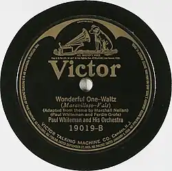 "Wonderful One" is a popular song recorded by the Paul Whiteman Orchestra on January 25, 1923 in New York and was released as Victor 19019-B.[1] The record reached no. 3 on the Billboard chart.[2] The song was also recorded as "My Wonderful One".