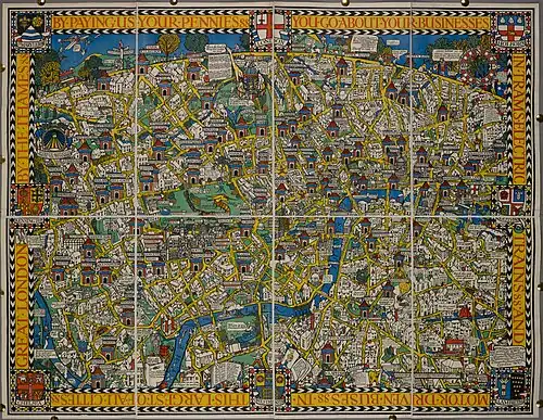 MacDonald was already a renowned decorative map-maker at the time of his commission.[3] His Wonderland map has been described as a "mixture of cartoon, fantasy, and topological accuracy" and became "an instant hit with the travelling public"; using solely primary colours, London appears as a medieval town in a medieval map (for instance, using a "decorative cursive script and dotting chivalric shields" around the edge),[1] with contemporary aspects interspersed, combined with satirical commentary on "accent, class and social mobility [that] were major preoccupations of 1914 London".[2] MacDonald also inserted cameos of both his brother and Frank Pick; for the latter, a figure near Victoria is depicted as saying "my Pick cannot be surpassed".[4] It has been described as a precursor to TFL's later Art on the Underground campaign and various spin-off tube maps.[2]