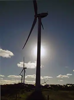 The Wonthaggi Wind Farm in Campbell Street was built in 2005. It is an environmentally friendly wind power station with six turbines.[11] The Bass Coast Shire Council was opposed to the wind farm along with some local residents. Protesters argued that it would taint the view of Cape Patterson on the trip from Anderson to Wonthaggi and would affect the "recreational tourism and landscape values of the coastline". By September 2005 the six towers had been built, but were themselves a tourist attraction, seen clearly as you drive down the hill towards Wonthaggi from Anderson.[12] The wind farm generates power up to 80% of the time, providing electricity for up to 6000 homes. It can be seen when visiting Williamsons Beach and the Victorian Desalination Plant.[13]