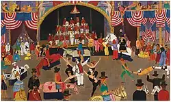 Gaylor had two paintings accepted for exhibition at the 1913 Armory Show which Kuhn had helped to organize.[10] Both were said to be impressionist in style.[6] In 1915, he painted an abstract work (shown at right) and became a member of the short-lived Cooperative Mural Workshop run by Katherine Dreier and her sister Dorothea. When he participated in a group exhibition held by the group that year (and possibly showed that painting), a critic described the works on view as "brilliant and vivid" in color and "simple and direct" in design.[11] The next year, in February, the Thumb Box Gallery gave him a solo exhibition and he participated in a group exhibition at the Montross Galleries.[12][13] Calling the solo exhibition "exceedingly interesting", a critic for American Art News said the carved and painted wood panels he showed were "exceptionally good in color and design" and noted that Gaylor "utilizes humans for designs in an amazing way".[14] In reviewing the group show, a critic described the painting called "Dawn" that Gaylor contributed as "well designed, but with terra cotta colored and non-modeled figures of a father and mother whose child is darker than they are."[13] The painting, "Social Dance" of 1915-16 (shown at right) may have been included in this exhibit. In October 1916, he showed works in a group exhibition at Montross Galleries organized by the New York Society of Etchers.[15] In 1917, Gaylor joined Kuhn and others in a short-lived group called the Penguin Club which, like the Armory Show, aimed to provide support for artists who rejected the conservative aesthetics of the National Academy.[2] In March of that year, he participated in one of the first exhibitions held by the club.[16] A critic described the drypoints, aquatints, and etchings that he showed as "interesting" with disconcerting color effects. The critic also said Gaylor's carved wood panels showed good drawing and striking coloring.[17]