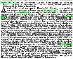 The Scott family bought Wood Hall in about 1790. It was advertised for sale in 1786 by the then owner Sir Walter Vavasour 6th Baronet.[4] Edward Whatmore bought the house but he died the following year.[5] Soon after it was purchased by William Fenton Scott, who was born in 1746.