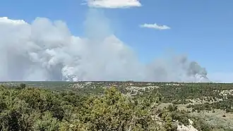 On June 29, the fire had grown to 3,000 acres (1,214 ha) and residents of Fluted Rock and Sawmill were told to be ready to evacuate if asked.[3] The fire acted "extreme" according to incident managers, with 200-foot flames forming due to 45 mile per hour wind gusts. The fire crossed Navajo Route 26 and moved northeast towards Navajo Route 7.[4]