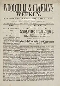 Woodhull & Claflin's Weekly was an American weekly newspaper first published on May 14, 1870, by sisters Victoria Woodhull and Tennessee Claflin. It was among the first publications to be published by women.[1] It lasted until June 10, 1876.