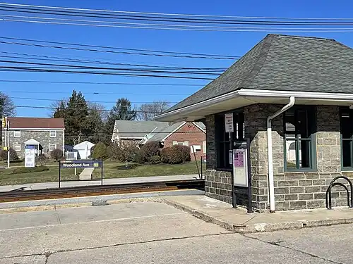 Woodland Avenue station is a stop on the D in Springfield Township, Delaware County, Pennsylvania. It is officially located on Woodland Avenue (PA 420) and Rolling Road, though Rolling Road is actually a block north of the tracks. A school and athletic field exists at the end of that intersection.