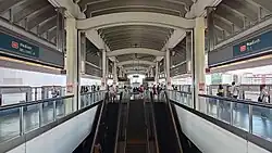 The TEL platforms are accessible via many escalators and stairs, with a large visual opening.[48] The linkway that connects the TEL platforms to the NSL platforms have gaps in the roof to allow sunlight into the station.[24] Largely naturally ventilated, the station utilises minimal energy. The four entrances of the TEL station are also naturally ventilated, with transparent structures to allow sunlight into the entrances. They are intended to function as "lanterns" that will light up the urban landscape around the entrances at night.[48][49] The station design won the LTEA 2022 under the Infrastructure and Development category.[50]