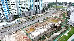 The station was first announced as part of the 22-station Thomson Line (TSL) on 29 August 2012.[7][8] In July 2013, Shanghai Tunnel Engineering Co. Ltd was awarded a S$421 million (US$336.5 million) contract for the construction of bored tunnels connecting from Woodlands station to Mandai Depot via this station. Tunnelling works were scheduled to begin in August that year.[9][10] In August, the contract for the design and construction of the station was awarded to Woh Hup Private Limited at S$144 million (US$115.1 million). Construction was scheduled to be completed in 2019.[11] The station's groundbreaking ceremony was held on 2 August 2014 at the Admiralty National Day Observation Ceremony.[12]