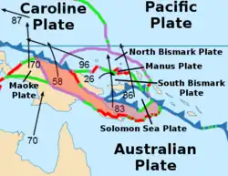 The Woodlark plate was originally proposed to be somewhat larger than currently is believed to be the case.[2][3] It is now suspected to have four active triple junctions, two of which are with the Australian plate to its south, based on areas of high seismic activity and other evidence.[3][4] As originally modelled it extended to the west along the east coast of New Guinea and was subducting beneath the Caroline plate along its northern border. This is no longer accepted to be the case, so that either the Solomon Sea plate,[5][6] or a further plate called the Trobriand plate must assume this role based on new information such as that from GPS groundstations.[1] In this previous model, the Maoke plate had converged on its west, the Australian plate converges on the south,[2] and on the east there was an undefined compressive zone which might have been a transform fault that marked the boundary with the adjoining to the north Solomon Sea plate. When further oceanographic studies defined that there was a transform fault they also potentially enlarged the size of the Solomon Sea plate or created the need for a further current plate.[7] It was also in this model contacting the South Bismarck plate to the northeast.[2]