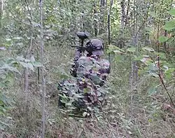 Woodsball equipment includes the standard mandatory paintball equipment, which includes marker, paintballs, harness/pod belt, and protective mask – but players also make use of other military items such as camouflage, combat boots, and ghillie suits.[6] Additionally, a player's equipment might vary depending upon their style of play, or position.