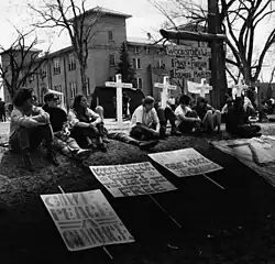 Students pitched tents and built makeshift shelters on a grassy area known as the Carnegie Green.[6] There they debated, performed, sang, talked and tried to make sense of their sorrow and anger. The spirit of those first few days replicated the peace and freedom of its namesake, the 1969 music extravaganza Woodstock.[7]