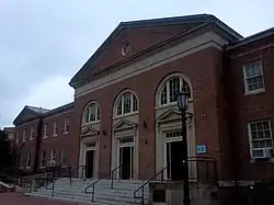 Bids for the construction contracts started in January 1937 with a 30-day deadline for submission,[27] but the deadline was extended through March 9.[28] On March 23, Wright announced the contracts for the building of the gym: J.A. Jones Construction Company for general construction, Reliance Engineering Company for heating, and W. M. Wiggins for plumbing.[29] The respective prices for the contracts were $415,957, $47,007, and $20,909.[29] Details were released regarding the buildings functions and specifications including the main gymnasium structure would be 303 by 175 feet (92 by 53 m) (while the gym floor would be 250 by 150 feet (76 by 46 m)), the swimming pool would be in a 220 by 82 feet (67 by 25 m) attached structure with a swimming surface of 165 by 55 feet (50 by 17 m), a lobby that overlooks the gym from the second floor that houses the classrooms, offices, and fan rooms.[29][30] The main gym floor gave room for two varsity basketball courts, along with courts for volleyball, intramural basketball, shuffleboard, handball, badminton, and one tennis court.[31] The ground floor contained the locker rooms, squash and handball courts, showers, and treatment rooms.[30] The maple hardwood would be installed over a concrete floor to cover the entire first, main floor.[30][31] The backboards for the goals were glass.[32] The building itself was built with colonial brick and trimmed with limestone.[30]