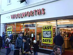 On 26 November 2008, trading of shares in Woolworths Group was suspended, and its Woolworths and Entertainment UK subsidiaries entered administration.[9] Deloitte closed all 807 Woolworths shops between 27 December 2008 and 6 January 2009, resulting in 27,000 job losses.[10] Woolworths Group plc entered administration on 27 January 2009,[11] and it was officially dissolved on 13 October 2015.[12] The collapse of Woolworths was a symbol of the credit crunch and financial turmoil in the United Kingdom at the end of 2008.[13][14]