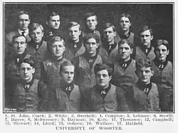 Wooster's athletic history dates back to its first baseball team, in 1880, which played only one game, losing 12–2 to Kenyon College. The football program was established in 1889; over its first two seasons, the team won all seven games it played, by a total score of 306–4. Included was a 64–0 victory at Ohio State on November 1, 1890, in the Buckeyes' first-ever home football game.[4] Shortly thereafter, intercollegiate sports were banned by the College President.[5]