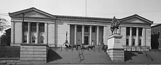The oldest portion of the current building was constructed in 1845 to a Greek Revival design by Boston architect Ammi B. Young on a parcel of land which had been the site of a courthouse since the 1730s. As originally designed, the building had a portico of six Corinthian order columns, modeled on those of the Tower of the Winds in Athens. In 1878 an addition, designed by Worcester architect Stephen C. Earle, was added to the rear of the building. In 1897 a major project to expand the building was approved by the state legislature. After a design competition the project was awarded to Boston architects Andrews, Jaques & Rantoul. Their design more than tripled the size of the building in a style complementary to Young's building. Young's portico was demolished though its columns were preserved–a condition of the competition–and were, with two replicas, distributed across the facade.[2][3]