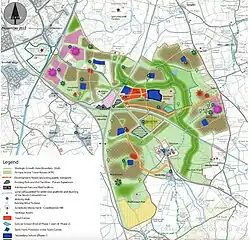 Part of the purpose for the station's development is that Worcestershire Parkway will be the focus of strategic development up to 2041. The strategic growth area extends to approximately 1,130 hectares (2790 acres) and is bounded by the M5, A44, the North Cotswold and Birmingham to Bristol mainline railways and Stoulton to the east. It is expected that development around Worcestershire Parkway will deliver up to 10,000 new homes; 50 hectares (123 acres) of employment sites; a new town centre; two secondary schools and seven primary schools and other supporting infrastructure. Health and other community facilities, including for sport and recreation will also be provided. The area will also benefit from the delivery of in excess of 40% green infrastructure which will include a community park and other smaller neighbourhood parks that will contain several LAPs, LEAPs and NEAPs. Several neighbourhoods will be planned throughout the site which will be linked to the social and community facilities by a network of safe and convenient pedestrian and cycle paths. The ‘Living Locally’ concept will also be applied which means that everyone will be able to meet their daily needs within a walkable catchment of 20 minutes.[7]