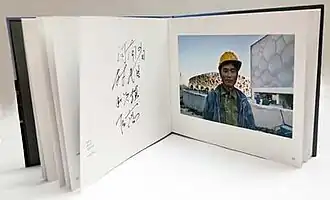 At the height of its construction, nearly 17,000 workers were involved in building the "Bird's Nest".[1] Workers 工人 documents the human side of construction with worker portraits, information on the workers themselves, and details on how Couchman carried out the project. In December 2007, Couchman circumvented security on the Olympic construction site and was able to approach the workers about taking their pictures.[2][3] She later returned to the site with two copies of each photo, giving each of her subjects one copy to keep and asked the workers to write their name and hometown on the other.[4] Couchman felt that the element of exchange was key to this project.[5]